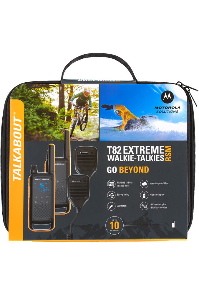 The Motorola T82 Extreme Twin Pack UK Plug RSM is an essential to any outdoor activity with its sleek, slim design and its stylish packaging. With 2 Remote Speaker Mics making it easier to communicate. As well as this, the Motorola T82 Extreme is a tough, robust radio with a wide range of features such as offering a weatherproof IPx4 rating. These next-generation Motorola radios also have a hidden display that only comes alive when you need it, making calling easier while it’s easy pairing button ensures that setting up is easy.